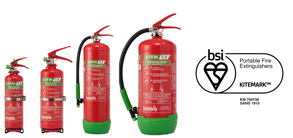 The SANS 1910-2022 approved, Lith-Ex fire extinguisher range, from SafeQuip, carries NTA 8133:2021 (KIWA/POOO55865) test approval, which proves its lithium-ion battery fire extinguishing capability.